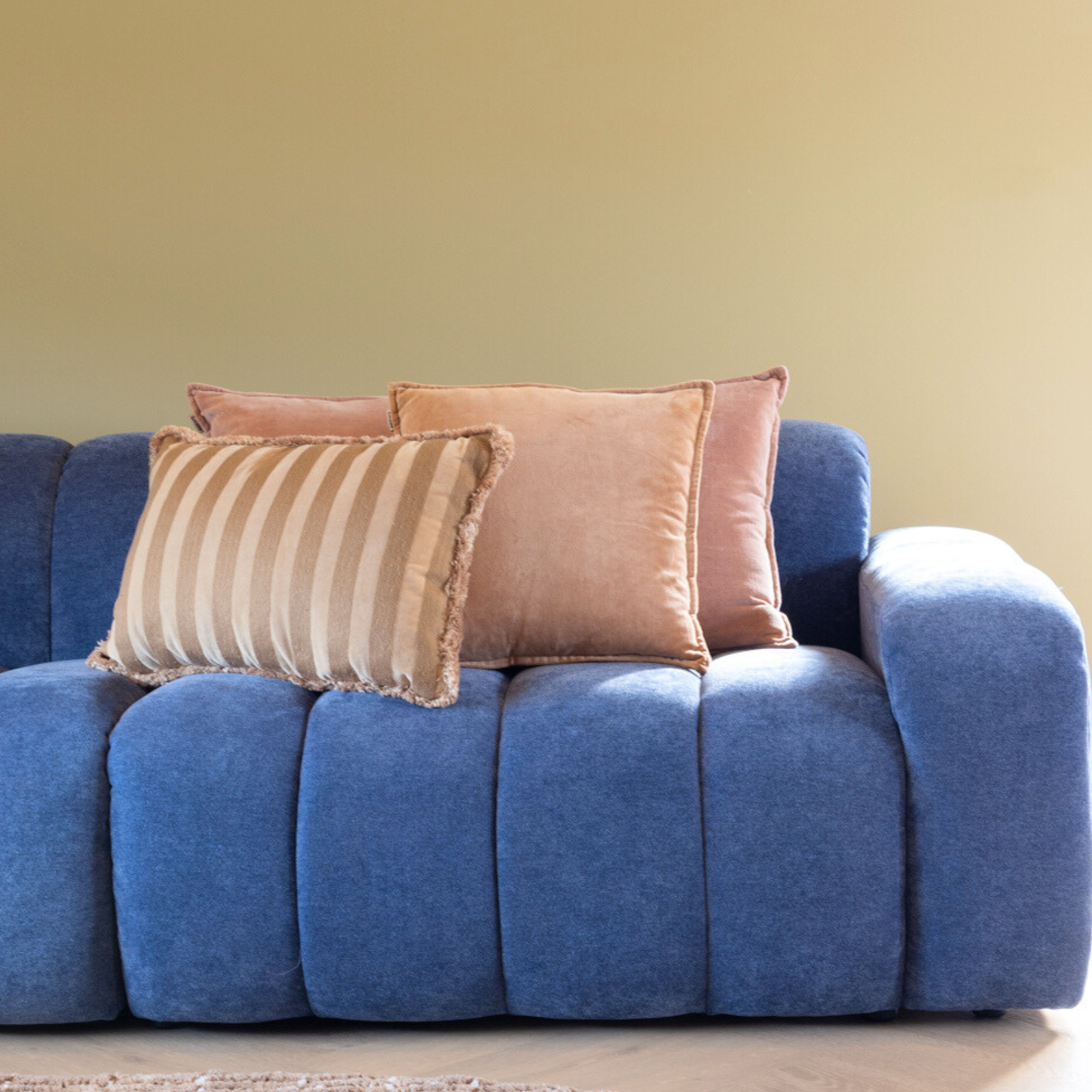 Deze set is ideaal voor wie een zachte basis wil combineren met warme accenten. Pretty in Pink brengt rust en luchtigheid, Caramel Crunch voegt warmte en diepte toe en Bold Beige zorgt dankzij de strepen en franjes voor een verfijnde, speelse twist. De variatie in formaten – XL, vierkant en rechthoekig – creëert een mooi gelaagd geheel dat elke zithoek tot leven brengt. De hoogwaardige stoffen voelen luxe aan en behouden lang hun vorm en uitstraling.