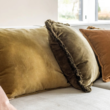 Sierkussen Olive Oasis (effen olijfgroen met franjes) – 45 x 45 cm