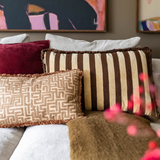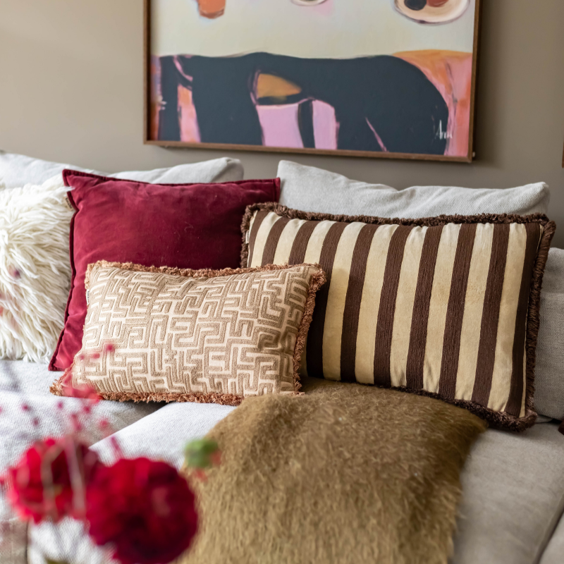 Chocolate Chic brengt warmte en structuur door de strepen. Magical Mauve voegt een diepe, rustige kleur toe. Bold Beige zorgt voor een licht contrast en een speels detail met print en franjes.