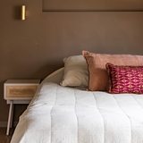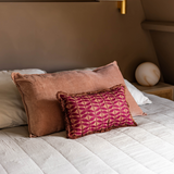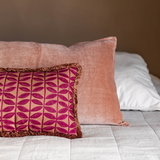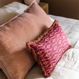 Samen vormen ze een harmonieus geheel: het XL kussen brengt rust en elegantie, terwijl de print en franjes van Blushed Berry een verrassende en levendige twist geven.