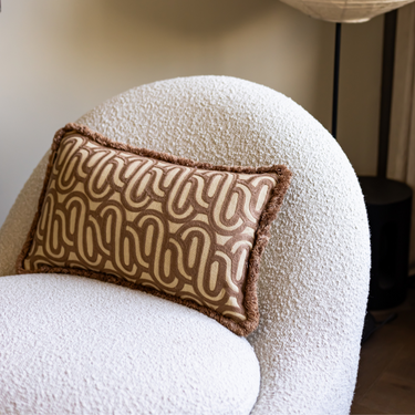Deze combinatie brengt rust én warmte in elke ruimte. De mauvetint straalt elegantie uit, de karameltint voegt een natuurlijke zachtheid toe en de beige swirl-print met franjes zorgt voor een speels accent.