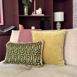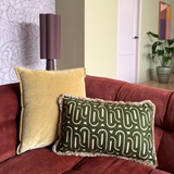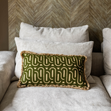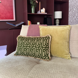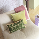 – Olive Oasis (30 x 50 cm): ein rechteckiges beiges Kissen mit olivgrünem Aufdruck und verspielten Fransen, dezent und raffiniert zugleich