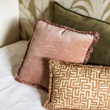 – Pretty in Pink (45 x 45 cm): quadratisches Kissen mit Fransen aus weicher puderrosa Baumwolle
