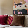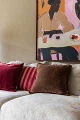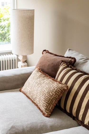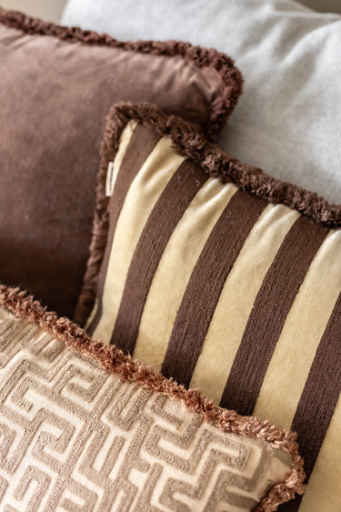 Chocolate Chic strahlt Wärme und Harmonie aus. Die tiefe, satte Farbe bildet eine solide Basis und lässt sich mühelos mit Beige, Creme, Mauve und anderen Naturtönen kombinieren. Die Fransen verleihen dem Kissen Struktur und eine dezente, dekorative Note, ohne dabei aufdringlich zu wirken.