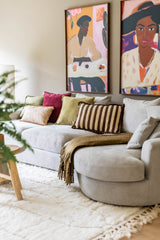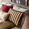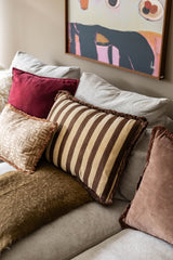 Die Kombination aus hellem Beige und Schokoladenbraun erzeugt eine warme, natürliche Atmosphäre, die zu vielen Einrichtungsstilen passt. Die Streifen verleihen dem Muster eine ruhige, dynamische Note, ohne dabei überladen zu wirken. Die rechteckige Form bildet einen schönen Kontrast zu den quadratischen Kissen und macht den gesamten Look verspielter und lebendiger.
