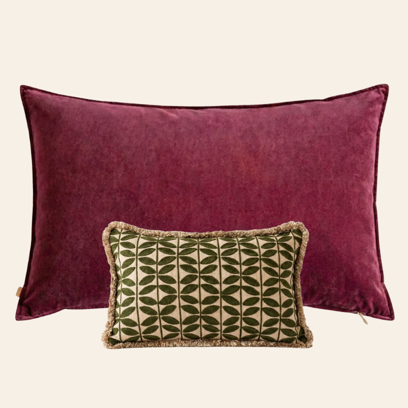 Das Amara-Set kombiniert das XL-Kissen „Magical Mauve“ (50 x 90 cm) mit dem 30 x 50 cm großen Kissen „Olive Oasis“ mit Schmetterlingsmuster und Fransen. Der tiefe Mauveton bildet eine ruhige, edle Basis, während der bedruckte und strukturierte olivgrüne Akzent für eine raffinierte Note sorgt. Zusammen verleihen sie Ihrem Sofa, Sessel oder Bett im Handumdrehen Charakter und ein besonderes Ambiente.