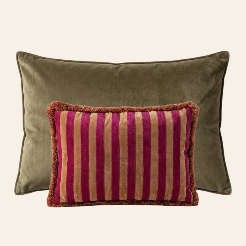 Das Eliza-Set vereint natürliche Ruhe mit einem raffinierten Farbtupfer. Das XL-Kissen (50 x 90 cm) in Olive Oasis bildet mit seinem sanften Olivgrün eine ruhige, zeitlose Basis. Das rechteckige Kissen (40 x 60 cm) in Blushed Berry verleiht mit seinen Streifen und Fransen Wärme und Charakter. Zusammen schaffen diese Kissen eine elegante und einladende Atmosphäre für Ihr Sofa, Ihren Sessel oder Ihr Bett.
