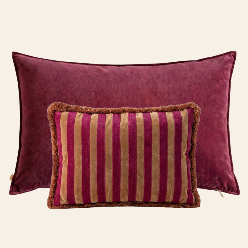 Das Laurine-Set kombiniert das XL-Kissen in Magical Mauve (50 x 90 cm) mit dem 40 x 60 cm großen Kissen in Blushed Berry mit Streifen und Fransen. Der tiefe Mauveton bildet eine edle Basis, während Blushed Berry für Wärme und Struktur sorgt. Zusammen ergeben sie eine markante, moderne Kombination, die Ihrem Sofa, Sessel oder Bett sofort ein besonderes Ambiente verleiht.