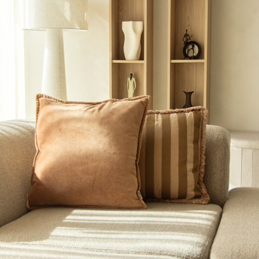 Samen creëren ze een harmonieus duo: het gestreepte kussen met franjes brengt speelsheid en beweging, terwijl het effen kussen rust en warmte uitstraalt.