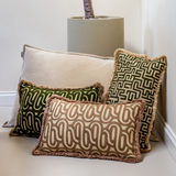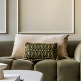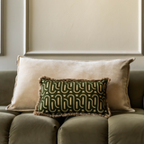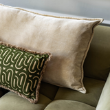 Olive Oasis (30 x 50 cm): een speels kussen met een groene print en franjes. Het handgemaakte ontwerp geeft extra textuur en een luxe uitstraling.