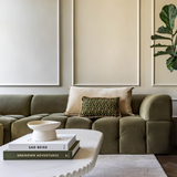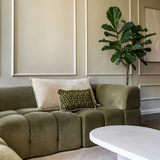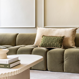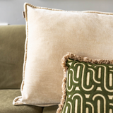 Samen creëren ze een harmonieus geheel: het XL kussen straalt rust en eenvoud uit, terwijl de print en franjes van Olive Oasis zorgen voor karakter en verfijning.