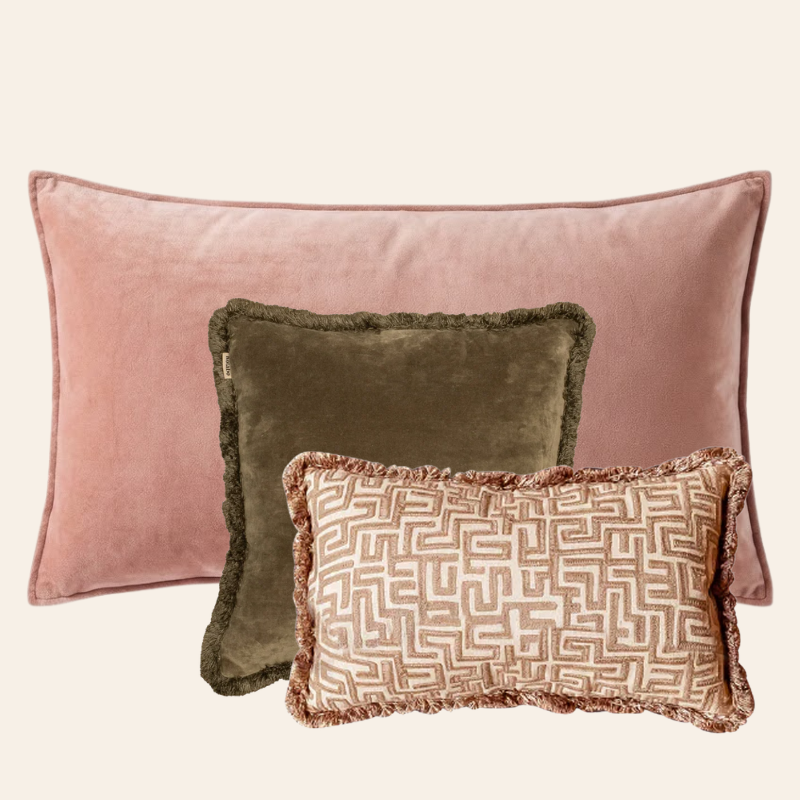 Pretty in Pink brengt zachtheid en rust, Olive Oasis voegt diepte en frisheid toe en Bold Beige geeft een speels grafisch detail met zijn Griekse print en franjes. De mix van XL-, vierkante en rechthoekige formaten zorgt voor een gelaagd effect dat visueel interessant en perfect in balans is.