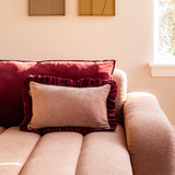 De Nola set brengt drie zachte maar sprekende tinten samen: het XL‑kussen Magical Mauve (50 x 90 cm), het sierkussen Pretty in Pink met bordeauxpaarse golfrand (30 x 50 cm) en het sierkussen Bold Beige met swirl print en franjes (30 x 50 cm). De rijke paarstinten en warme beige tonen geven samen een warme, stijlvolle look op je bank of bed.