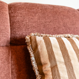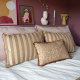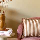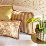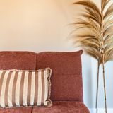 Looking for a cushion that's both stylish and playful? "Bold Beige," with its beautiful striped pattern and decorative fringe, is the perfect choice. The soft beige tones create a sense of calm, while the playful design adds a touch of flair to your interior. A bonus: the back is plain, allowing you to use the cushion subtly. Super versatile and a real mood-setter!