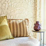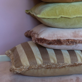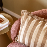 With its striped pattern, decorative fringes, and plain back, this cushion combines tranquility with playful details. The light beige tones work beautifully with natural materials like wood and linen, but also add a subtle twist to modern interiors. Whether you choose the printed or plain side, the cushion will effortlessly complement your style. Perfect for combining with other cushions .
