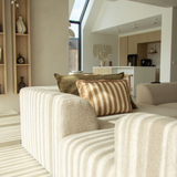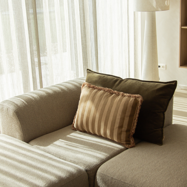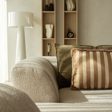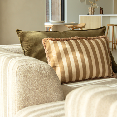 Samen vormen ze een evenwichtig duo: het XL kussen straalt rust en zachtheid uit, terwijl de strepen en franjes van Bold Beige zorgen voor karakter en dimensie.