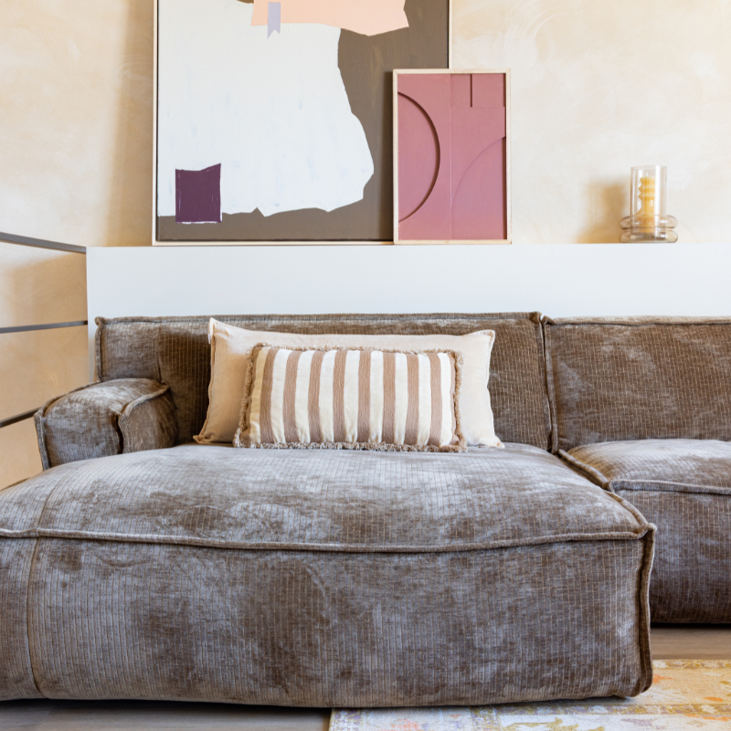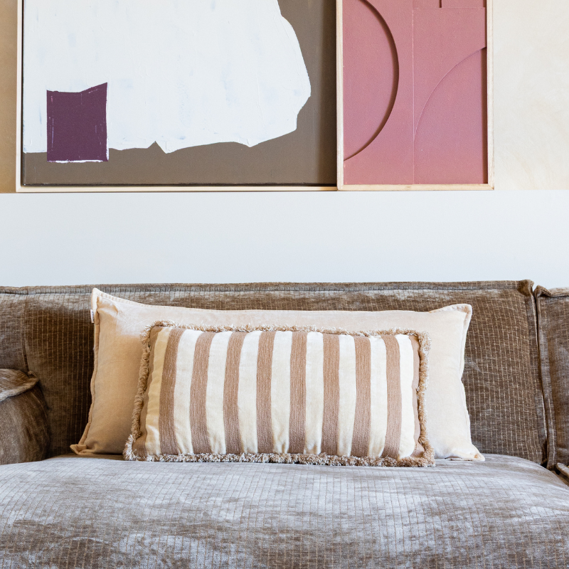 Los cojines del set Elsa están fabricados con materiales de alta calidad y se sienten suaves y cómodos. El cojín grande beige mantequilla ofrece una base tranquila y neutra que se combina fácilmente con diversos estilos de interior. El cojín beige intenso con flecos y rayas aporta textura visual y profundidad, creando un aspecto refinado y artesanal. Gracias a sus tonos suaves y naturales, el set encaja sin esfuerzo en interiores modernos, escandinavos, Japandi o clásicos.