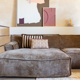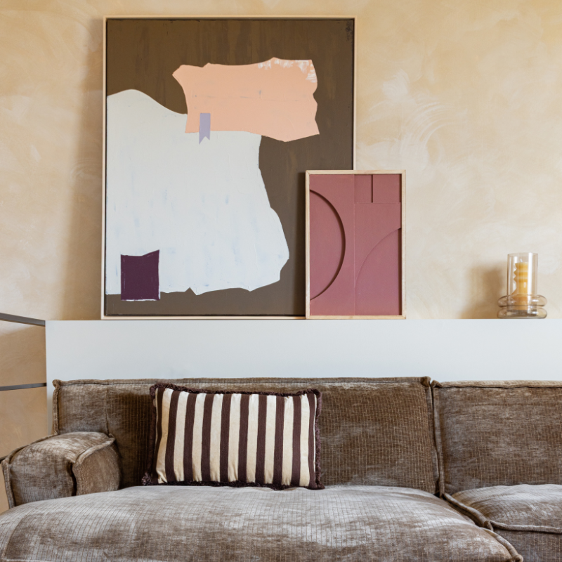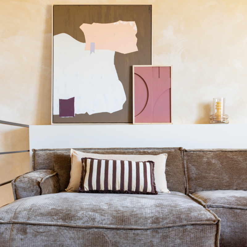 La combinazione di beige chiaro e marrone cioccolato dona un aspetto caldo e naturale che si adatta bene a diversi stili d’arredo. Le righe creano una dinamica tranquilla senza risultare troppo cariche. Il formato rettangolare crea un bel contrasto con i cuscini quadrati, rendendo l’insieme più giocoso e interessante.